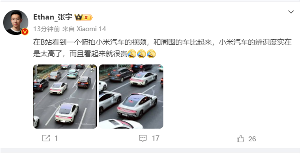 博主曬小米汽車俯拍圖:辨識(shí)度太高了 看起來(lái)就很貴